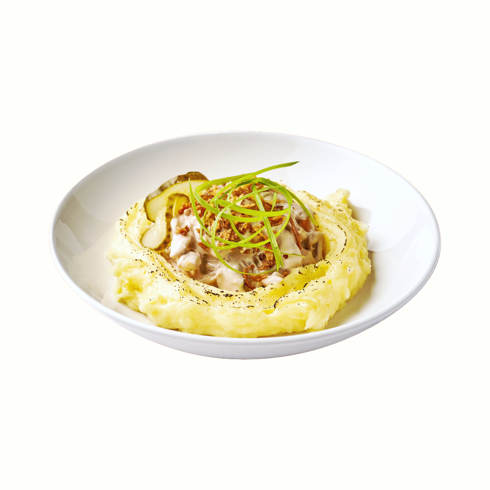 Филе индейки, шампиньоны, лук репчатый, сливки растительные, сметана, соус «Демиглас», лук жареный, огурец маринованный. Подаётся с картофельным пюре.