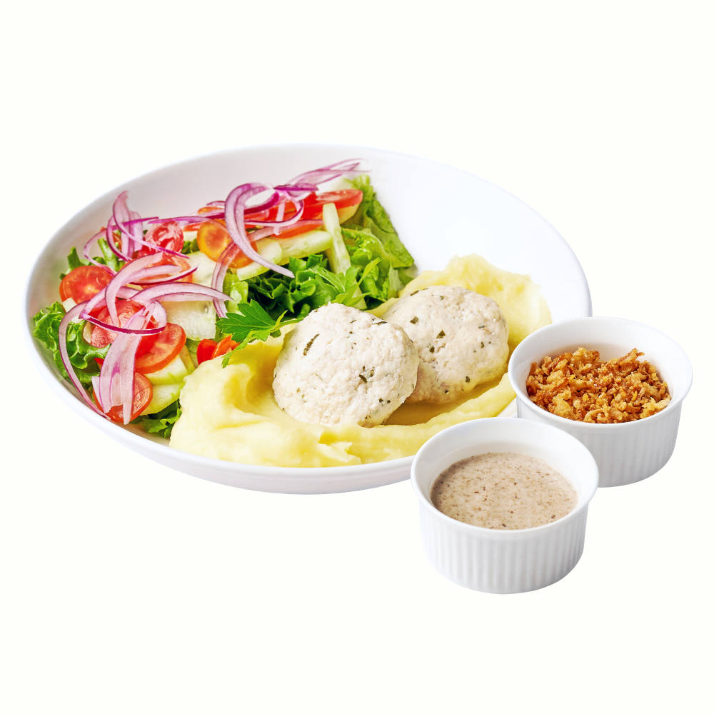 Куриные котлетки, картофельное пюре, овощной салат. Подаётся с трюфельным соусом и жареным луком.