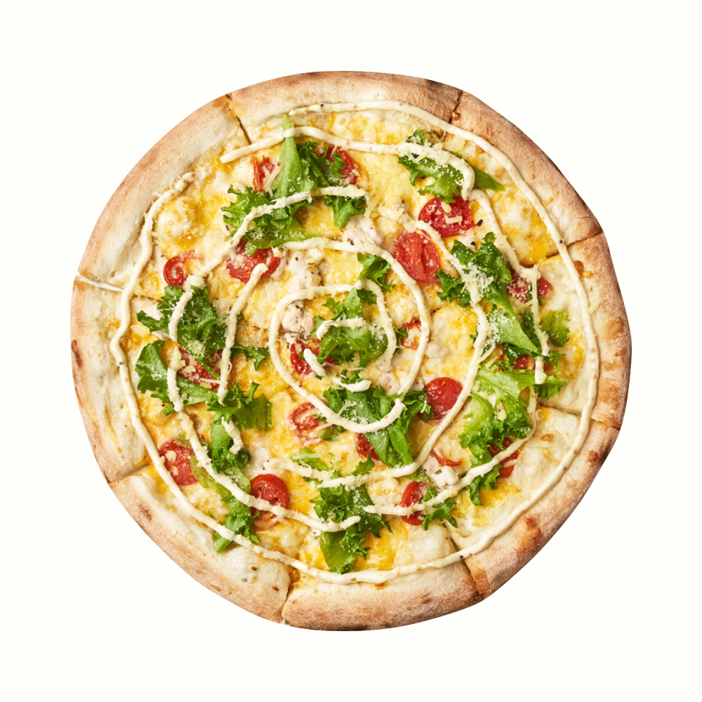 Тонкое итальянское тесто с хрустящими бортиками. Нежный белый соус и растительные сливки. Микс из двух видов сыра чеддер и твёрдой моцареллы. Куриное филе и помидоры черри добавляются до печи. После печи украшается хрустящим фрилисом, крошкой пармезана, настоящим соусом цезарь. Отдельно подаём соус крем для бортиков пиццы.