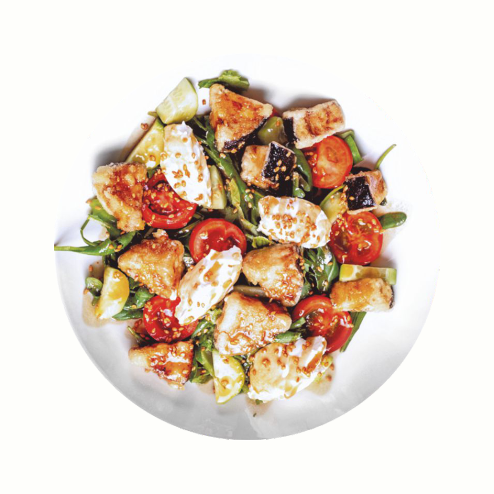 Хрустящий салат фриллис, рукола, заправка «Терияки», огурец, помидоры Черри, творожный сыр и обжаренный в кукурузном крахмале баклажан, семена кунжута