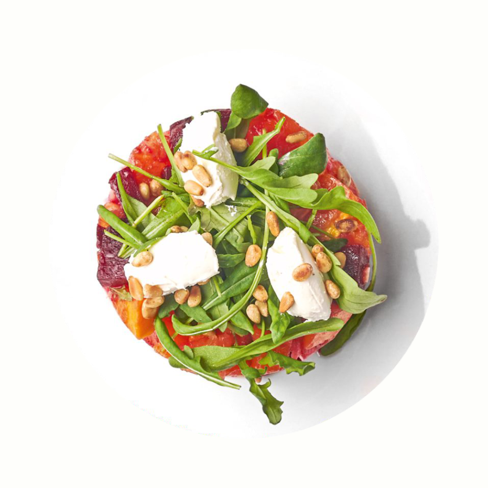 Тыква запечённая, свекла запечённая, мякоть апельсина, творожный сыр, орех кедровый, масло тыквенное, рукола