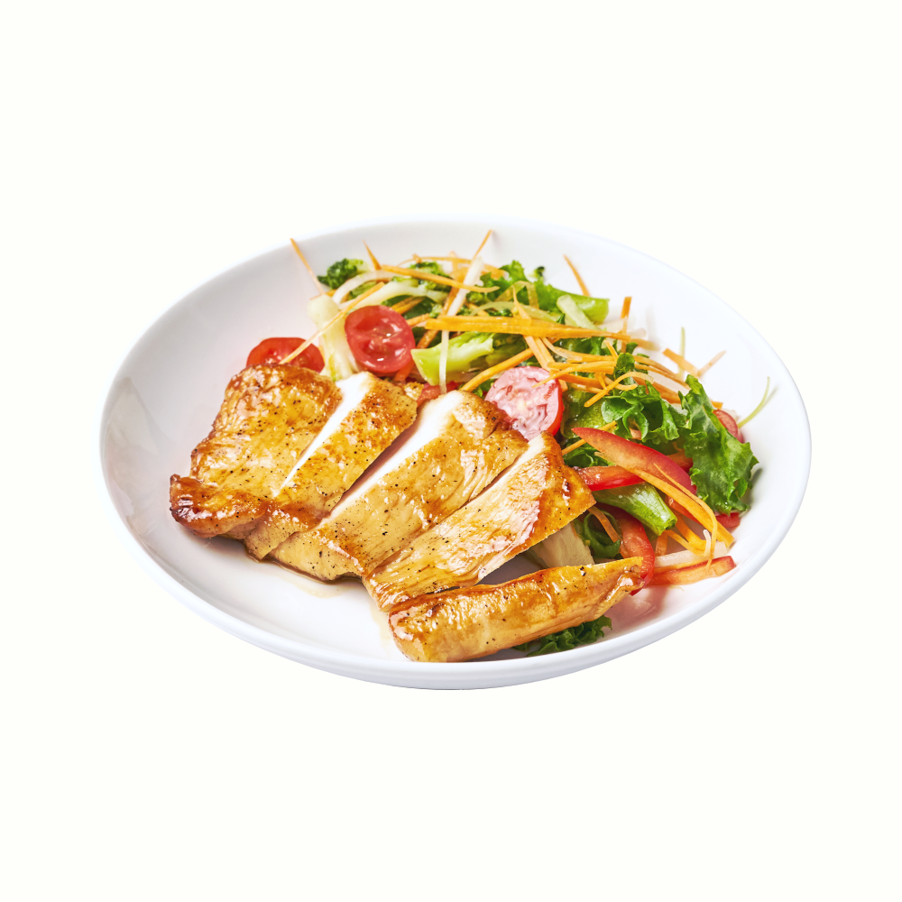 Филе индейки, мёд, соевый соус, чеснок. Подаётся с болгарским перцем, брокколи, морковью, помидоры Черри, сельдереем и листьями салата