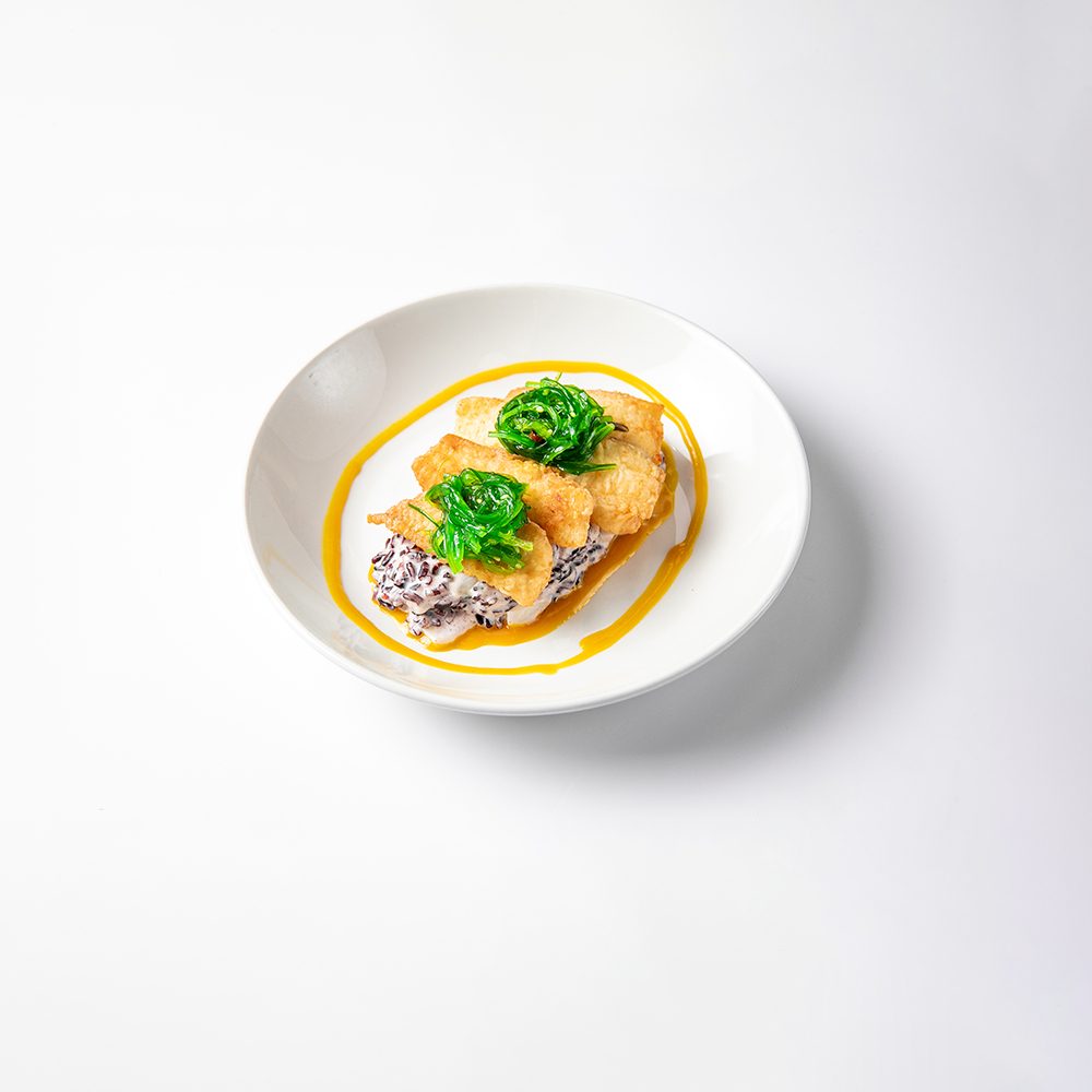 Камбала, рис Венере, сливки, сыр Памезан, кальмар, пюре маракуйя, растительное масло, чеснок, петрушка, шпинат, масло сливочное, мука